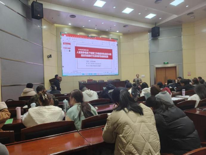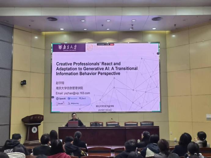 2025年11月24日上午,南京大学赵宇翔教授应邀做客我院“中和讲坛”,在太阳集团古天乐图书馆思诚厅作了题为“人智竞争视角下创意工作者应对生成式的适应性信息行为及转折性信息实践”的专题讲座,现场学术氛围浓厚,我系教师、各级研究生、本科生踊跃参与,讲座由我系主任李彩容副教授主持。