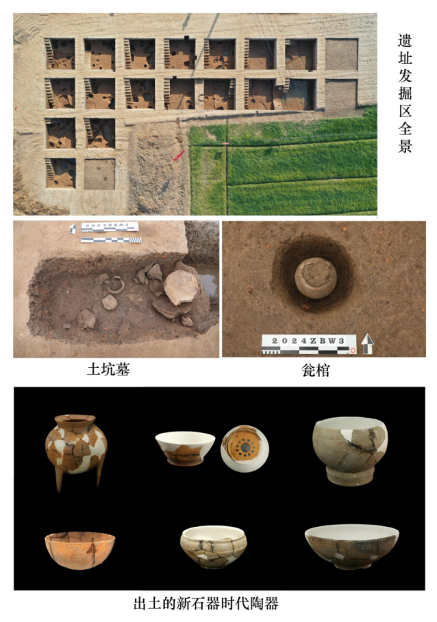 发掘区内文化层厚0.8~1米,可划分为5~7层,由东向西逐渐倾斜。除发掘区西部发现有少量东周时期遗存(如G1、H2)外,其余均属新石器时代遗存,包括灰坑235个、瓮棺27座、灰沟4条、灶3个、房基3处(其中两处房基发现柱洞15个)、烧土堆积3处、灰烬层4处、陶片堆积1处、房基垫土1处,另有柱洞74个、竖穴土坑墓1座。
