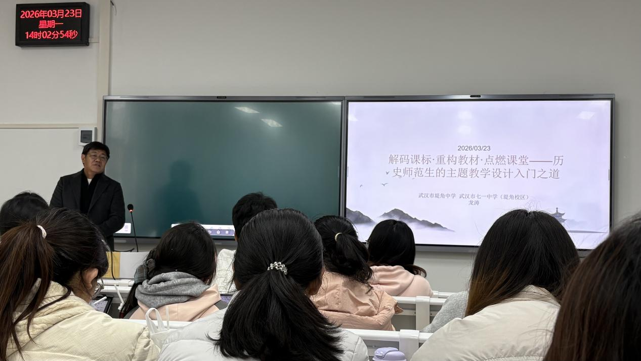 2026年3月23日下午两点,我院在4号教学楼210教室举办了一场以《解码课标·重构教材·点燃课堂——历史师范生的主题教学设计入门之道》为主题的精彩讲座。本次讲座由堤角中学高级教师龙涛老师主讲,2024级历史学(师范)专业本科生和2025级学科教学(历史)专业部分硕士研究生聆听了本次讲座,历史系副主任刘馗老师主持本次讲座。