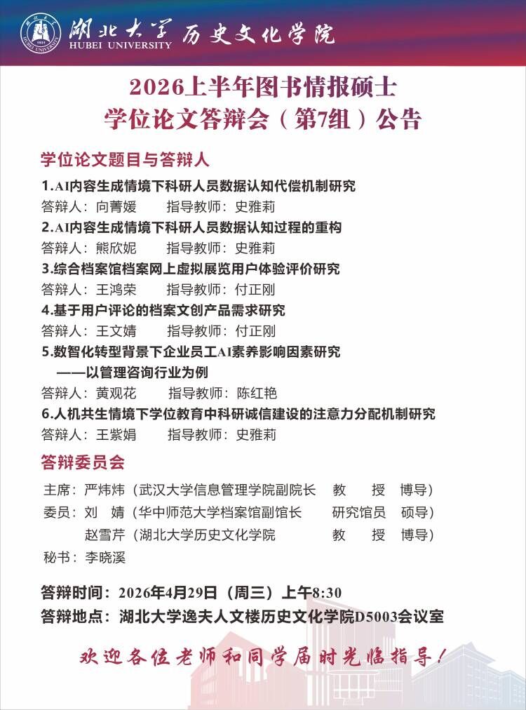 2026上半年图书情报硕士学位论文答辩会(第7组)公告