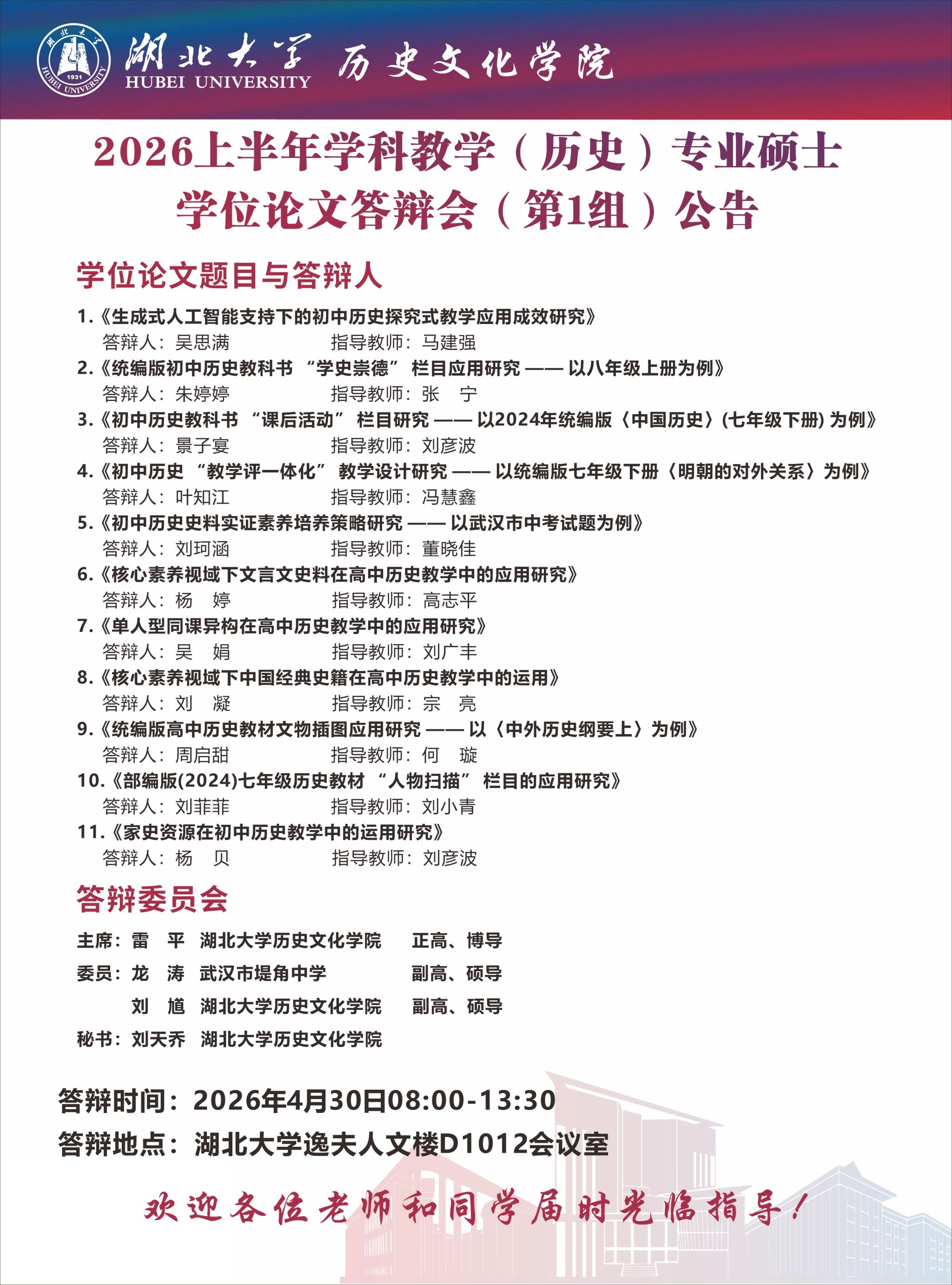 2026上半年学科教学(历史)硕士学位论文答辩会(第1组)公告