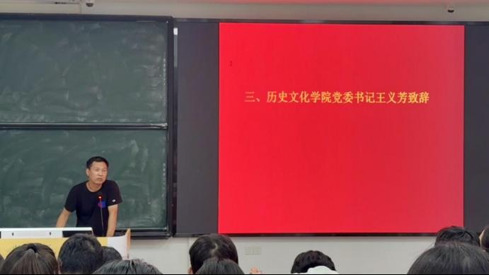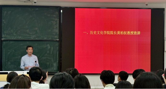 黄柏权院长首先致辞。他对全体新生的到来表达了热烈的祝贺与欢迎,并从五个方面分享了自己的体会:一是研究生身份的重塑,从知识的接收者转变为学术边界的探索者;二是研究生应掌握四大核心能力,即批判性思维、发现问题的能力、科学的研究思维与准确的学术表达;三是要坚守学术真理,塑造学术品格,形成开放包容的学术胸襟;四是要处理好学术与生活的关系,形成科学的时间管理机制,注重自身身心健康;五是师生相宜,构建“教学相长”的新型师生关系。黄院长希望同学们心怀热爱,勇往直前,在学术道路上稳扎稳打,走好未来每一步。