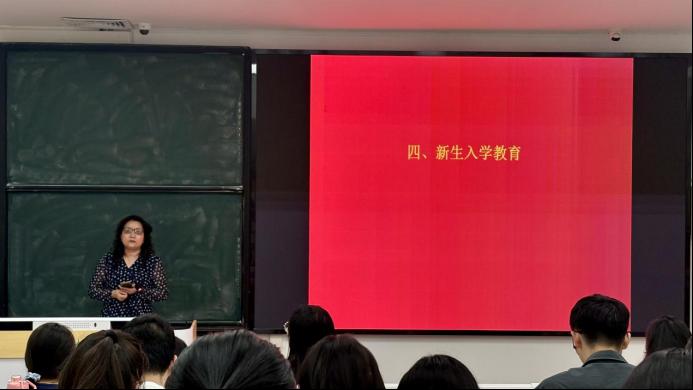 研究生秘书沈艳老师为研究生新生们详细讲述了研究生培养方案、考核制度、档案与实习实践等方面的事宜,强调同学们应当及时了解新消息,主动反馈问题。