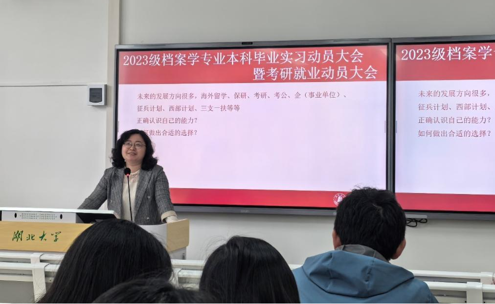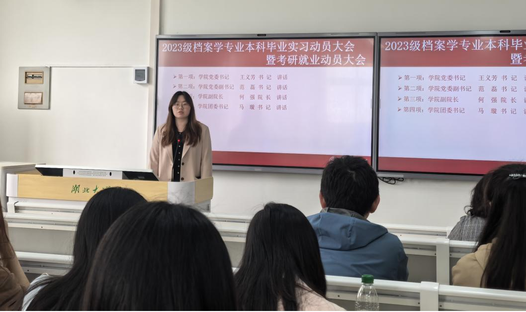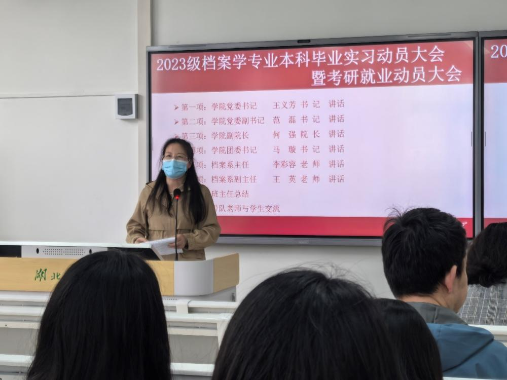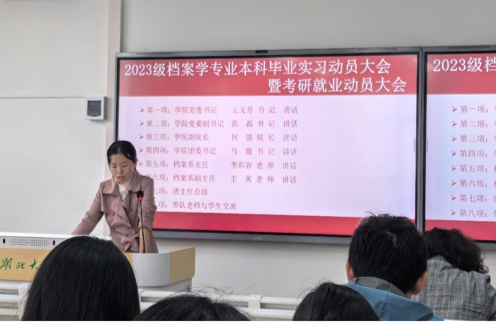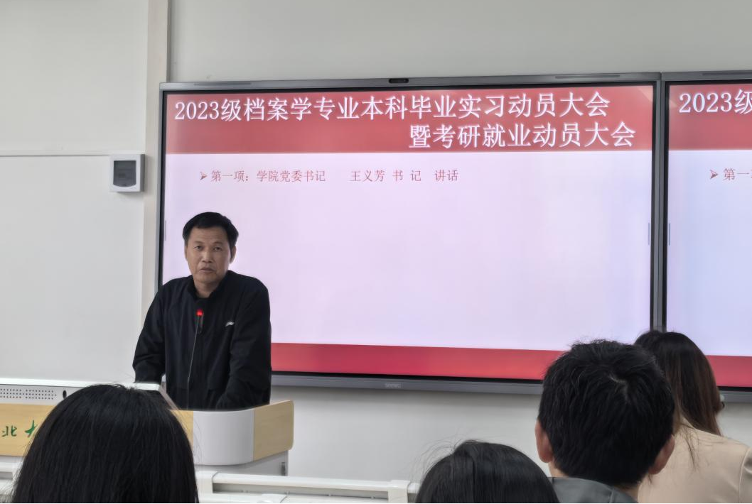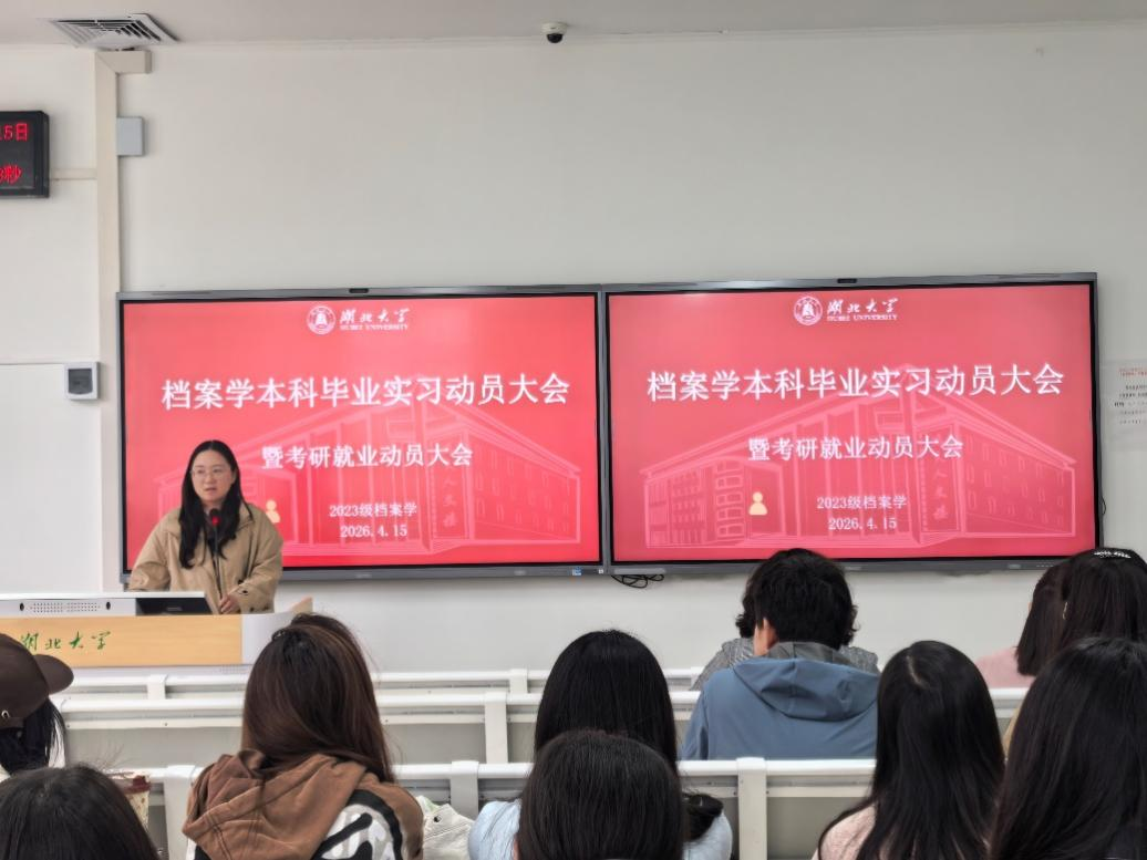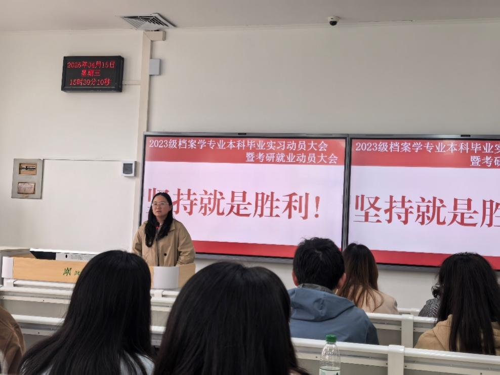2026年4月15日下午,2023级档案学本科毕业实习动员大会暨考研就业动员大会于教四203教室召开。会议由张静文老师主持,特邀9428cn太阳集团古天乐党委书记王义芳、团委书记马璇参加。档案系主任李彩容、系副主任王英、档案学系实习指导老师赵雪芹、李晓溪、史雅莉、李贞贞,以及档案学2301班全体同学参会。