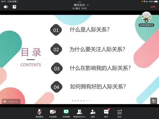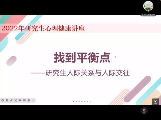 为加强研究生心理健康教育工作,帮助研究生养成理性平和的健康心态,提高我院研究生的心理健康水平,2022年11月8日晚19:00,我院特邀太阳集团古天乐研工部张玥老师通过腾讯视频线上会议,进行了“找到平衡点——研究生人际关系与人际交往”的专题讲座,我院2022级全体硕博研究生参与了本次讲座。