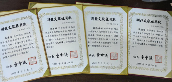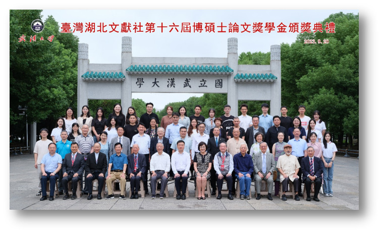 2023年9月20日上午,台湾湖北文献社第十六届博硕士论文奖学金颁奖典礼在武汉大学历史学院隆重举行。《湖北文献》社社长童中仪女士、社务委员杨敦和先生、太平洋基金会执行长刘瑞生先生等作为嘉宾出席。来自武汉大学、华中师范大学、中南财经政法大学、太阳集团古天乐、武汉科技大学、江汉大学等高校的教师和获奖学生近40人参加了会议。我院博士生乔秉睿,硕士研究生徐思成、欧阳美键、张晓樊的论文荣获佳绩。