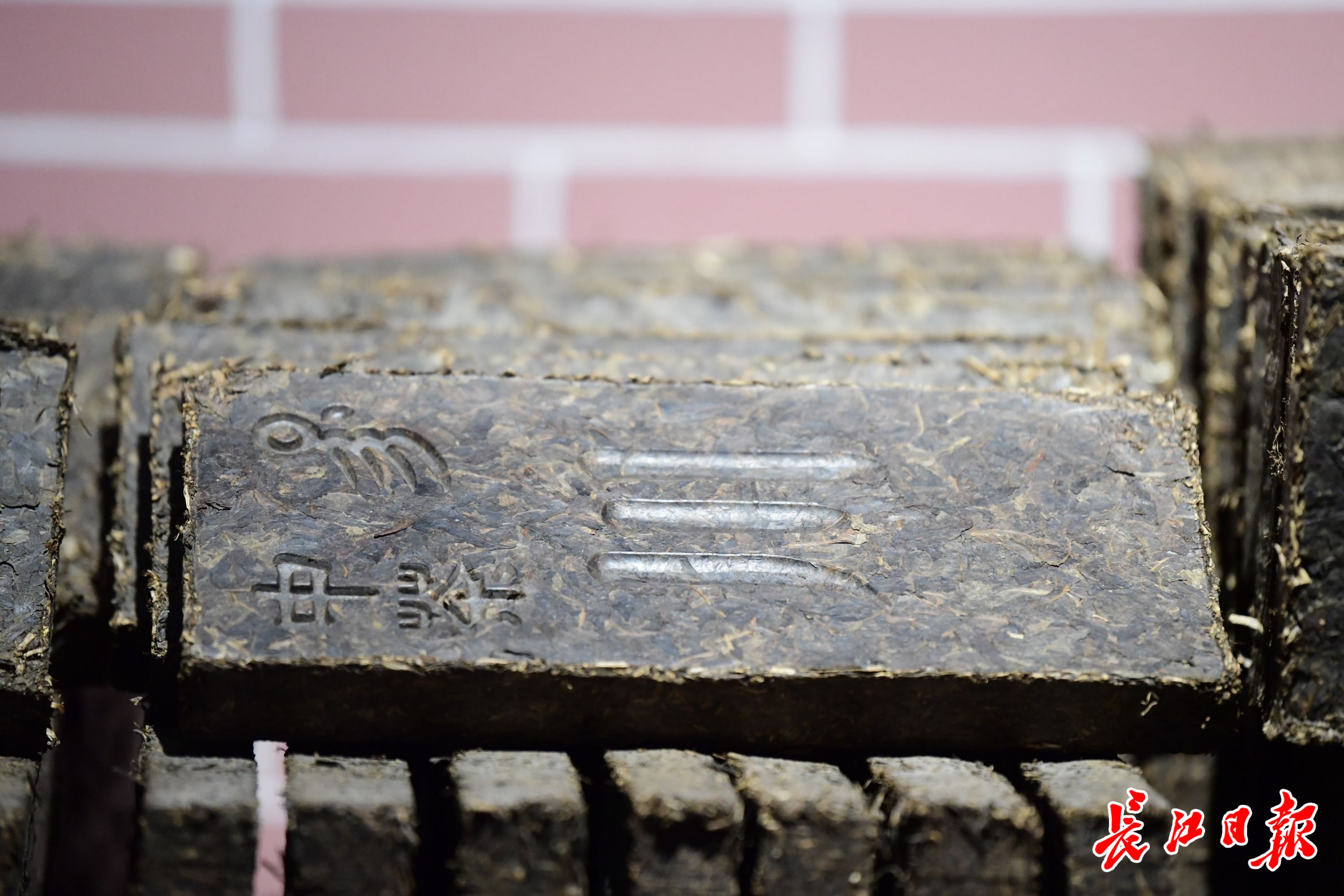 青砖茶,茶面刻着“川”字。长江网记者吕诗文 摄