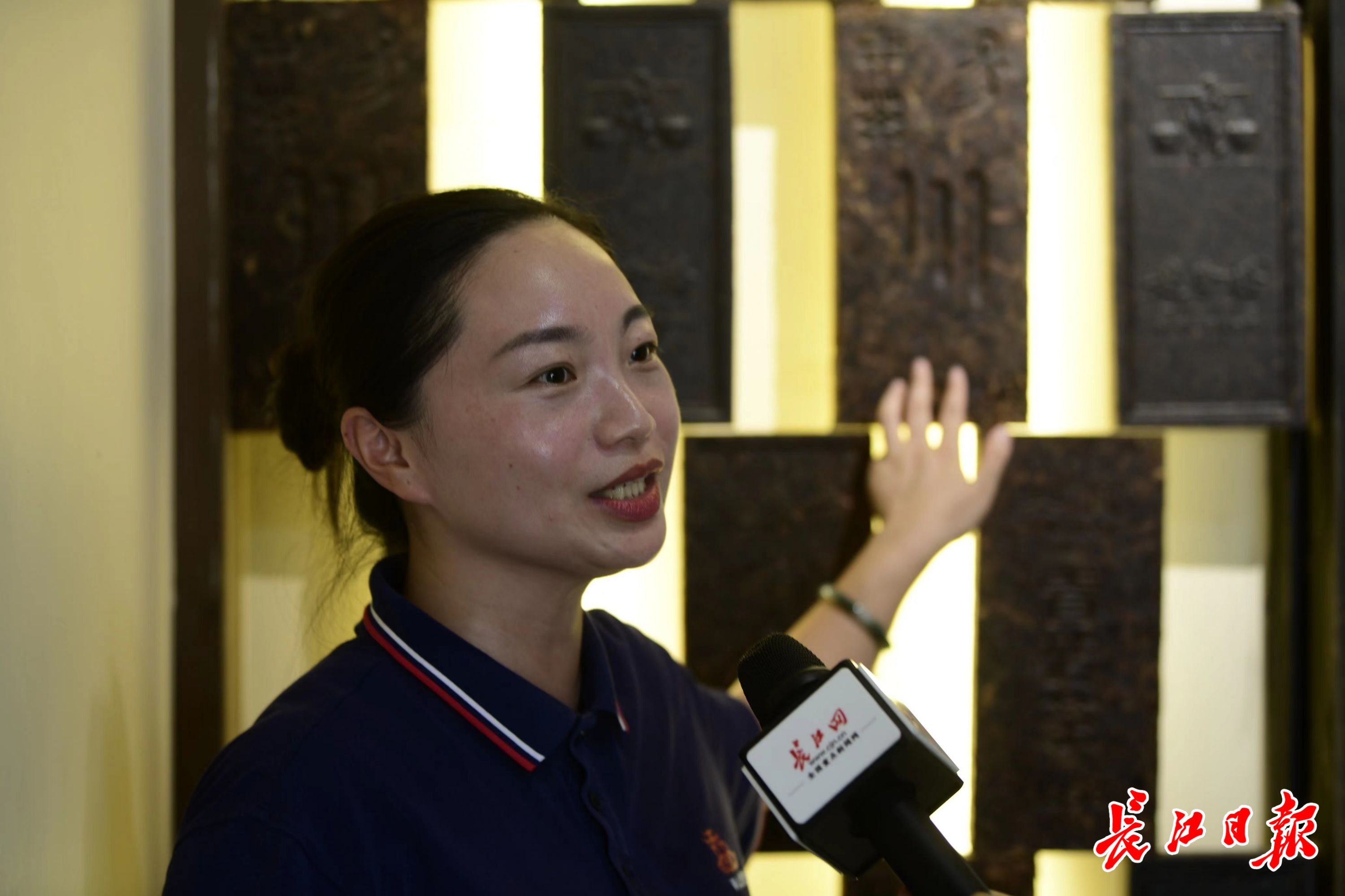 饶洁正在给探访团成员们讲述“川”字号砖茶由来。长江网记者吕诗文 摄